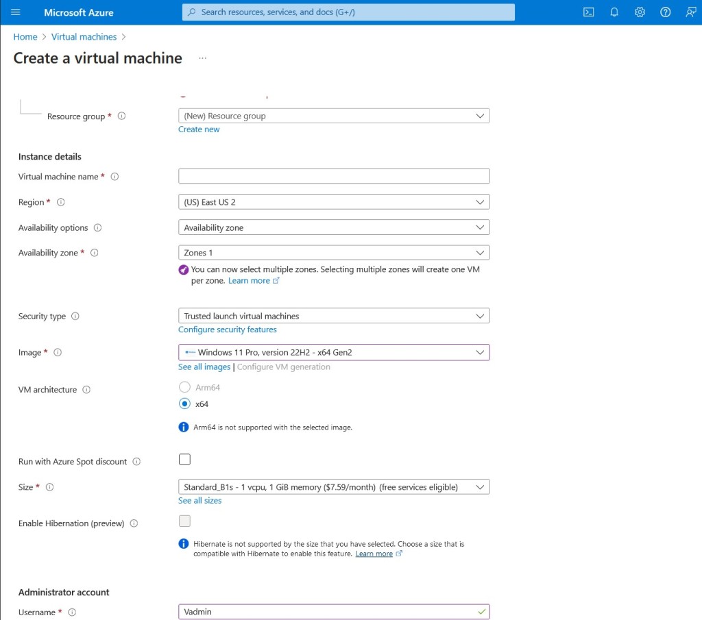 To begin, I registered a new Azure account and set up a new virtual machine (VM), specifying the location as the US and using Windows 11 Pro as the image. I created admin credentials (Username: Vadmin) and established a resource group named ‘HPVM_group’.