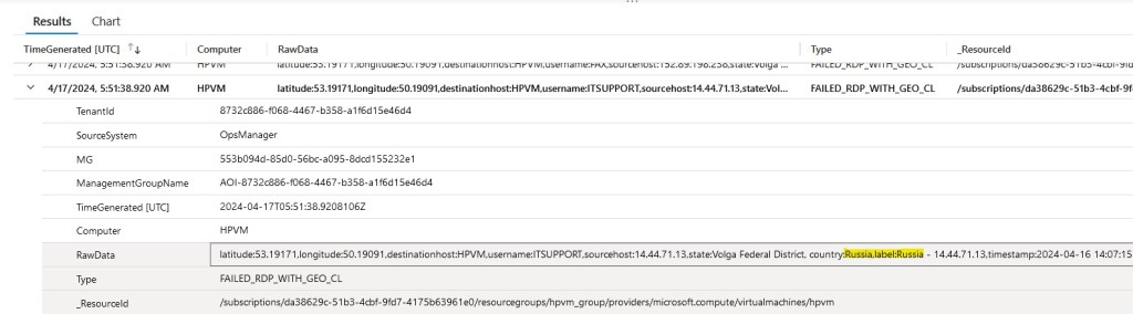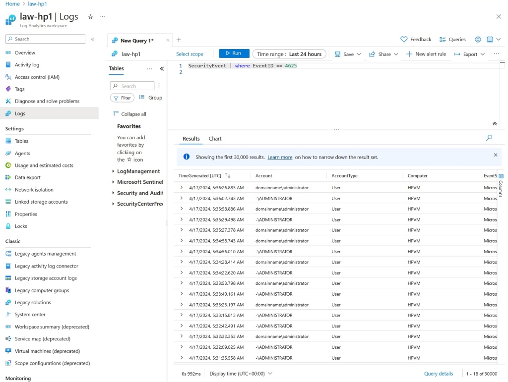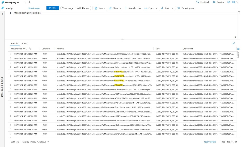 After letting it do synchronization, I could run the log from the Log Analytics Workspace. Here you can see the data a little better. Displayed are the times and the account names used to attempt to connect to my VM.
