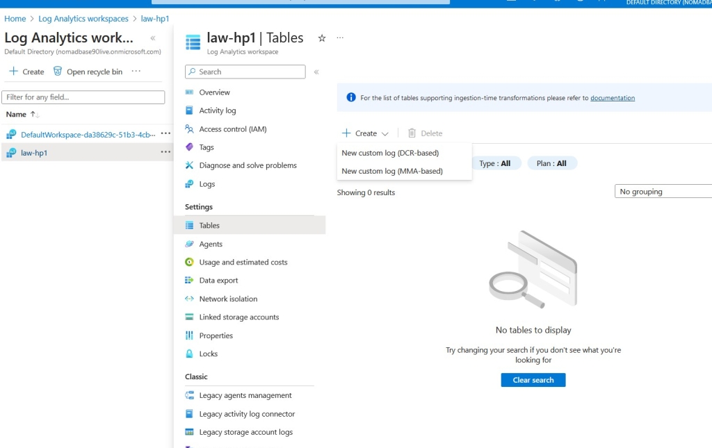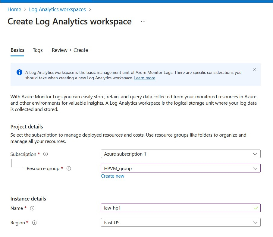 Next, I created a Log Analytics Workspace (LAW), which serves as a central repository for log data. I named it ‘law-hp1’.