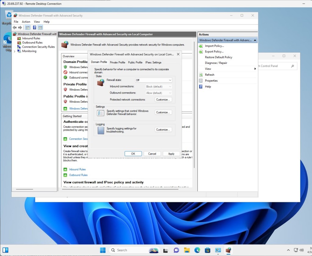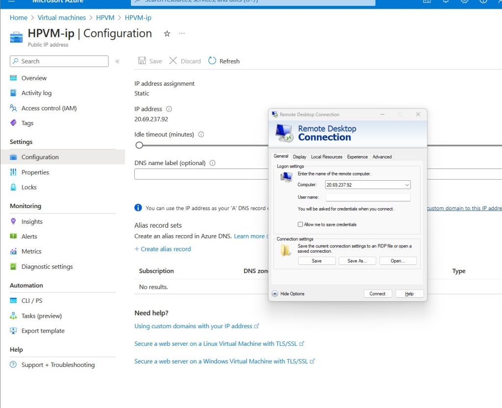 Next, I connected to my VM using an RDP. All I had to do was set it to the IP (20.69.237.92) and then hit connect and provide the credentials.