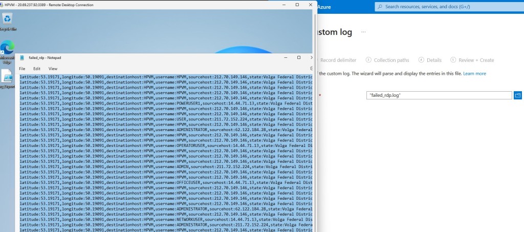 I then uploaded the failed_rdp log from the VM to the LAW as a custom log under the Tables section, setting the collection path to the VM’s file destination (C:\ProgramData\failed_rdp.log).